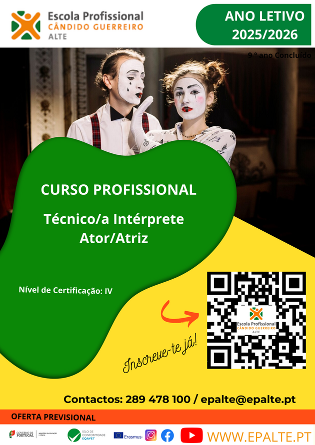 O Curso Profissional de Técnico/a Interprete Ator/Atriz, tem a duração de 3 anos e confere um diploma de nível secundário de educação e um certificado de qualificação profissional de nível 4.